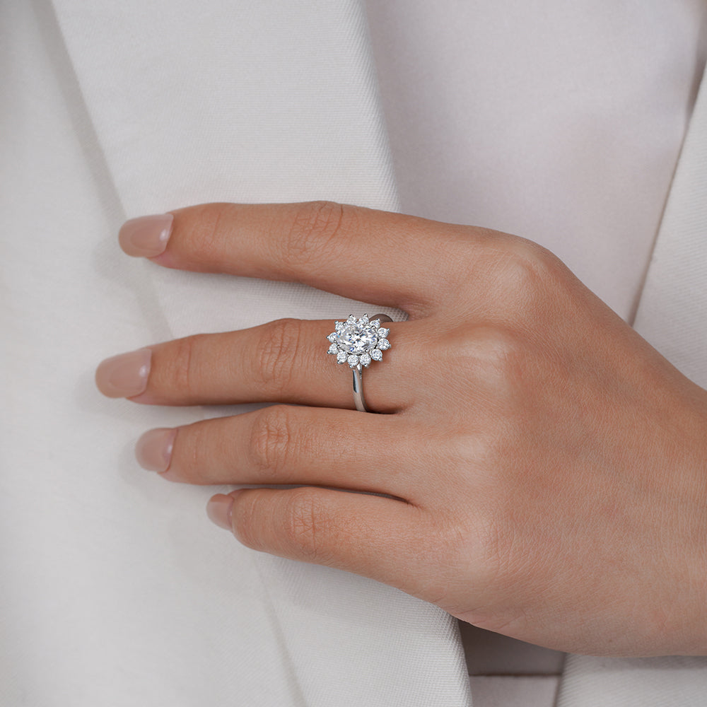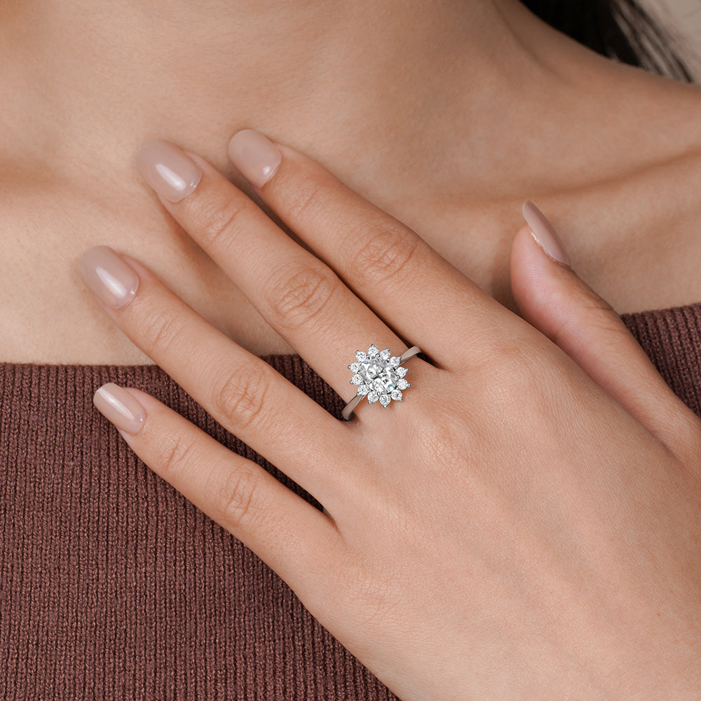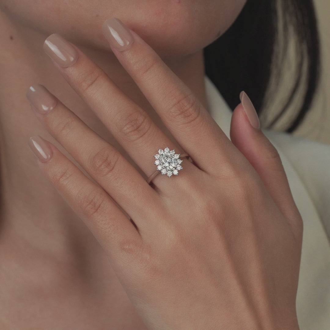 A timeless floral halo ring celebrating love in full bloom. A brilliant round-cut lab-grown diamond blooms at the center of a delicate floral halo, radiating light and romance from every angle. Crafted in your choice of solid 14K or 18K gold, this elegant design captures timeless beauty with a modern, sustainable touch—created to celebrate a love that lasts forever