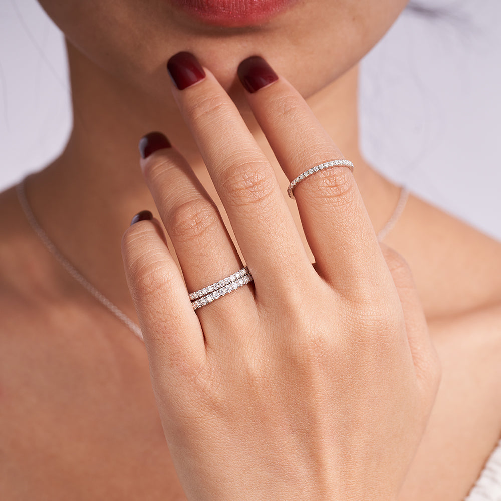 【Top Grade Moissanite with More Sparkle】-This moissanite diamond band is made of 100% REAL MOISSANITE, which is as hard as natural diamond. It has greater fire and brilliance than any other gemstone. Also, it won't tarnish or discolor and it is more cost-effective than a diamond. Crafted with 14K White Gold, this metal offers heightened durability and is gentle on sensitive skin. With its smooth edges, this ring ensures a comfortable wearing experience without any risk of snagging on skin or clothes.