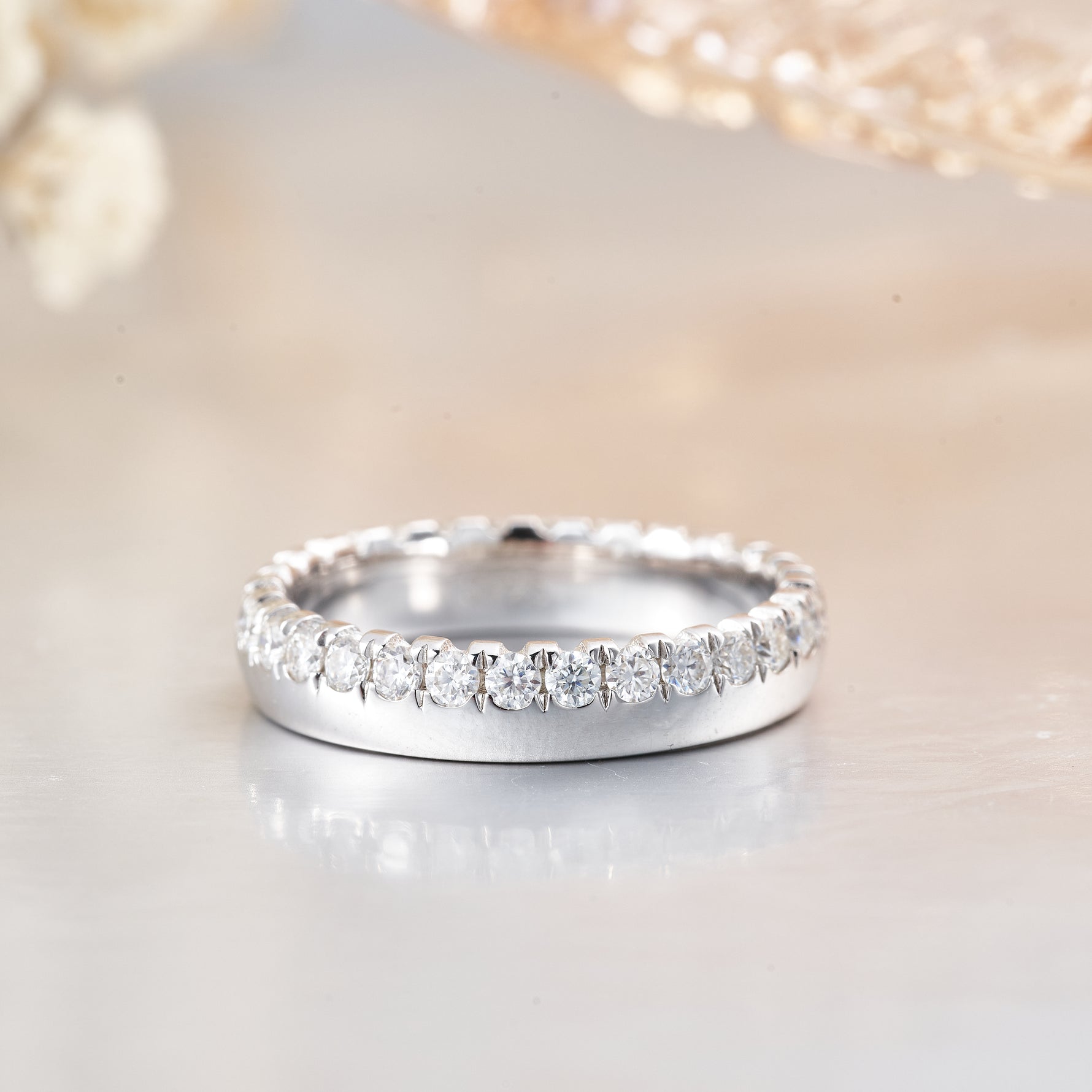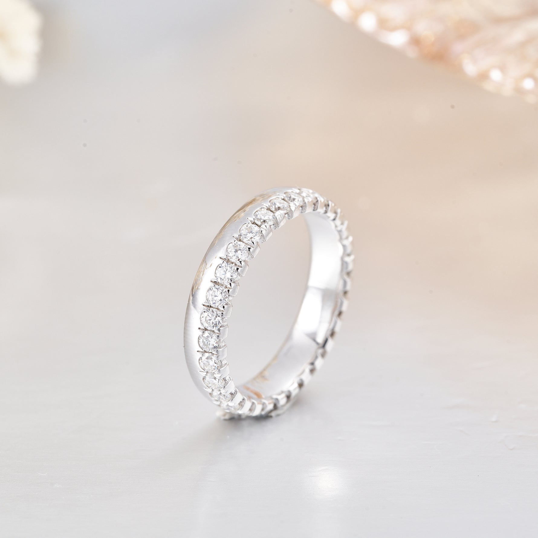 【Top Grade Moissanite with More Sparkle】-This moissanite diamond band is made of 100% REAL MOISSANITE, which is as hard as natural diamond. It has greater fire and brilliance than any other gemstone. Also, it won't tarnish or discolor and it is more cost-effective than a diamond. The metal of the ring is 925 sterling silver with 18K White Gold Plated, which is 100% Hypoallergenic, Lead-free & Nickel-free.