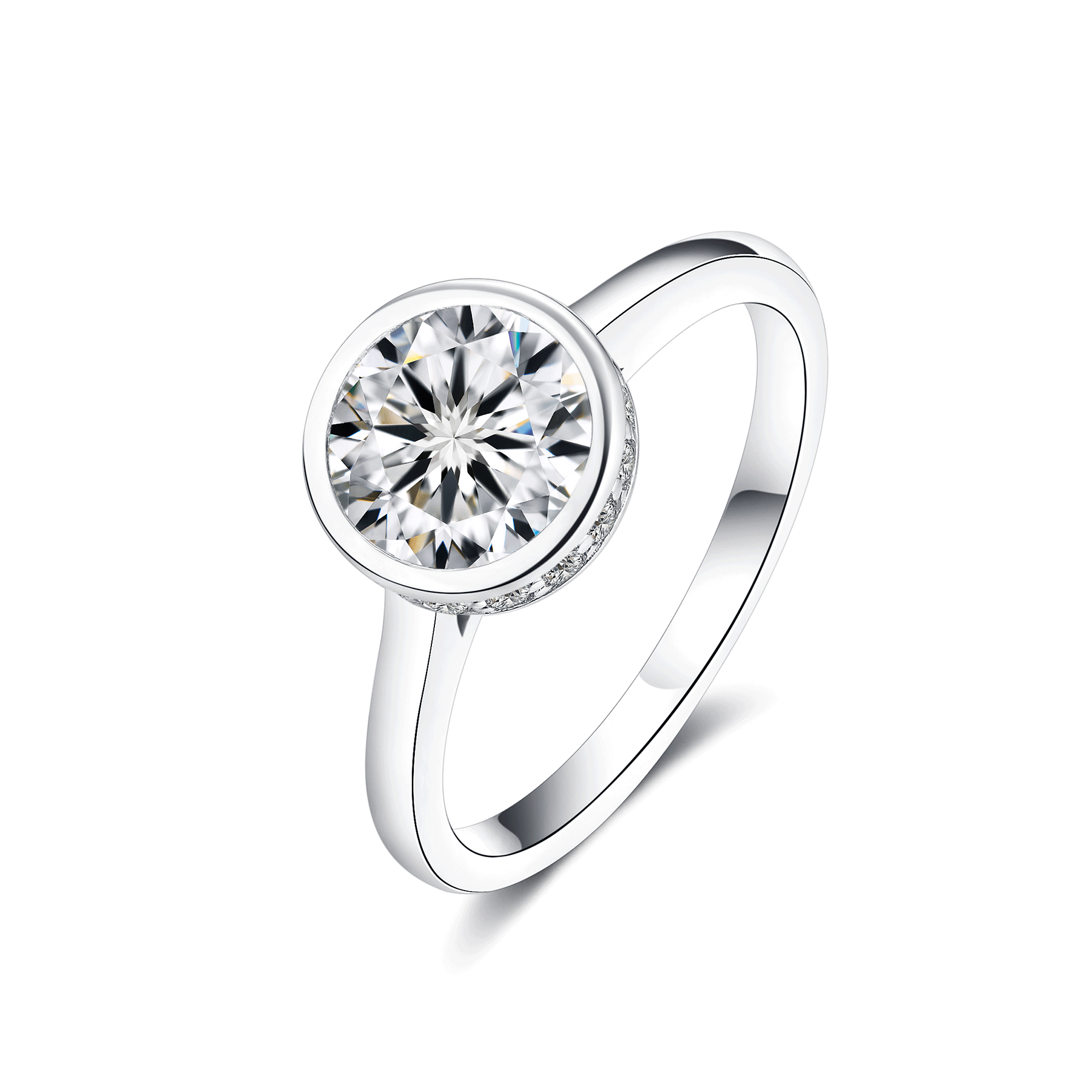 Lab-Grown Diamonds with More Sparkle This ring features a brilliant lab grown diamond set in a sleek bezel setting,enhanced by a subtle hidden halo for added sparkle . Expertly set to maximize its dazzling fire and diamond-like durability, it promises a lifetime of luminous sparkle that will never fade. A timeless symbol of love, it offers breathtaking beauty and exceptional value — an irresistible testament to your forever story.